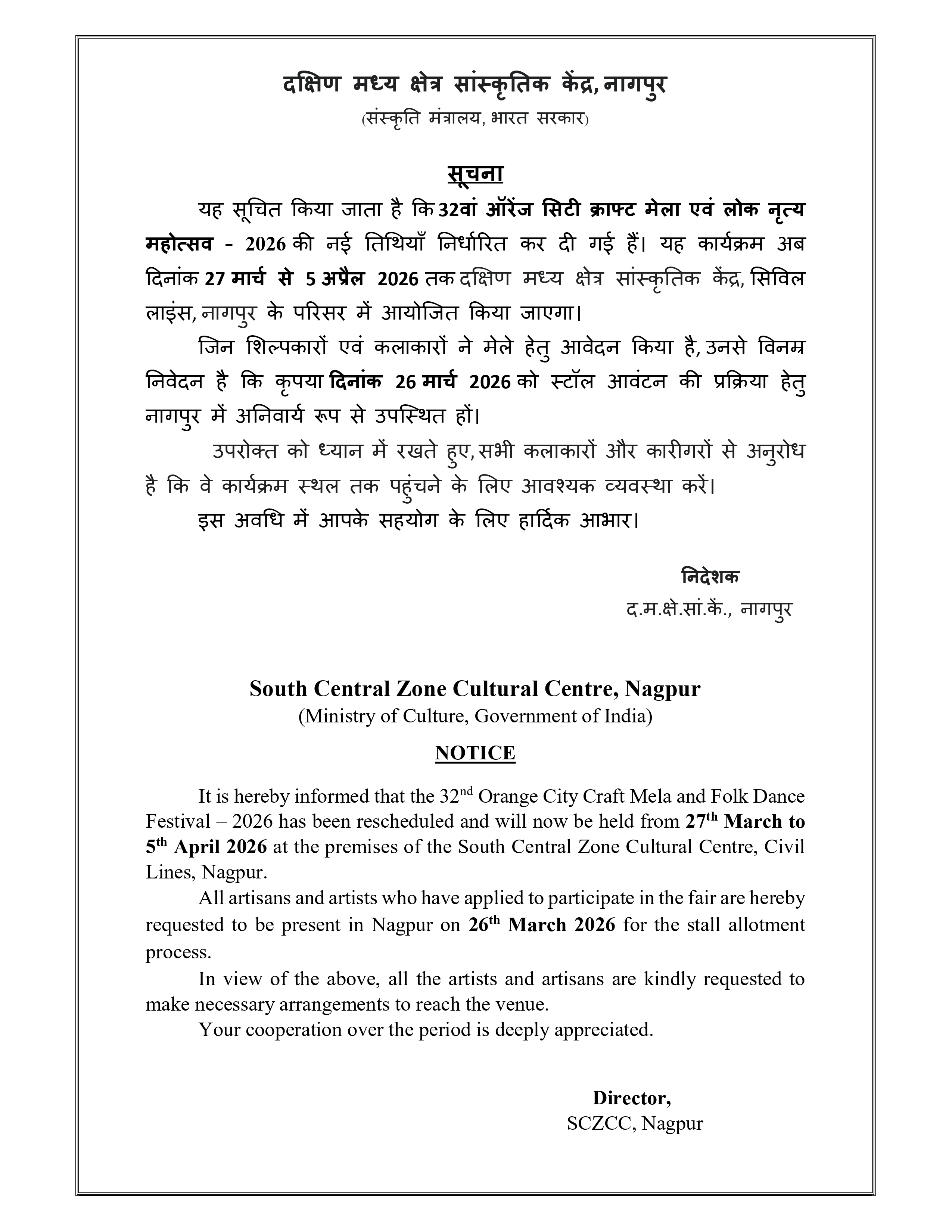 South Central Zone Cultural Centre, Nagpur has announced that the new dates for the 32nd Orange City Craft Mela and Folk Dance Festival - 2026 have been fixed from 27th March to 5th April 2026.