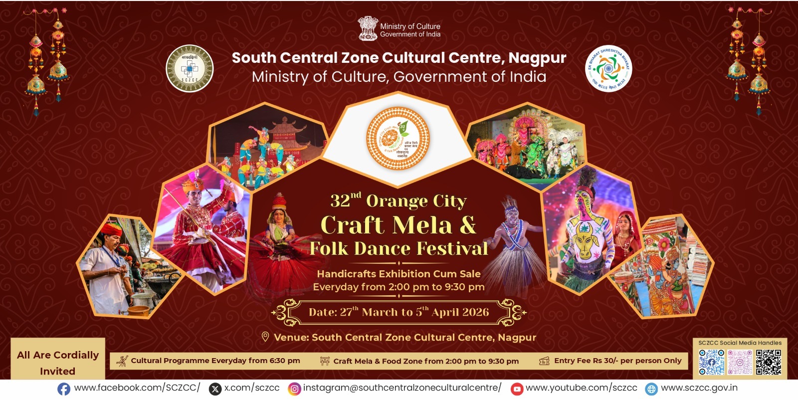 South Central Zone Cultural Centre, Nagpur has announced that the new dates for the 32nd Orange City Craft Mela and Folk Dance Festival - 2026 have been fixed from 27th March to 5th April 2026.